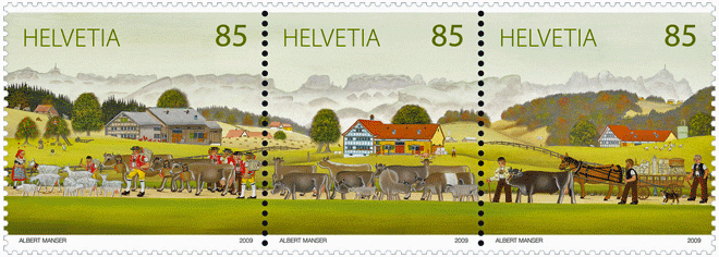 Vor vier Jahren war die Appenzeller Ziege bereits auf einer Sondermarke der Schweizer Post anzutreffen. Drei zusammenhängende Marken im Wert von je 85 Rappen zeigten die Alpabfahrt im Appenzellerland mit den Ziegen an der Spitze. Die Marke wurden vom wohl bekanntesten Appenzeller Bauernmaler Albert Manser gestaltet. Die Sujets des Alpaufzugs sind so gekonnt verteilt, dass auch die Einzelmarke eine gültige Aussage macht: Leitkühe mit Ziegen, Bauernhof und Lediwagen.